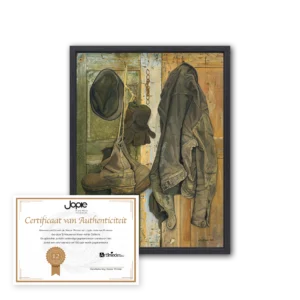 Jopie Huisman – Stilleven met leren jas van Jelmer, als hoogwaardige giclée canvasprint, geleverd in een luxe zwarte cadeauverpakking.